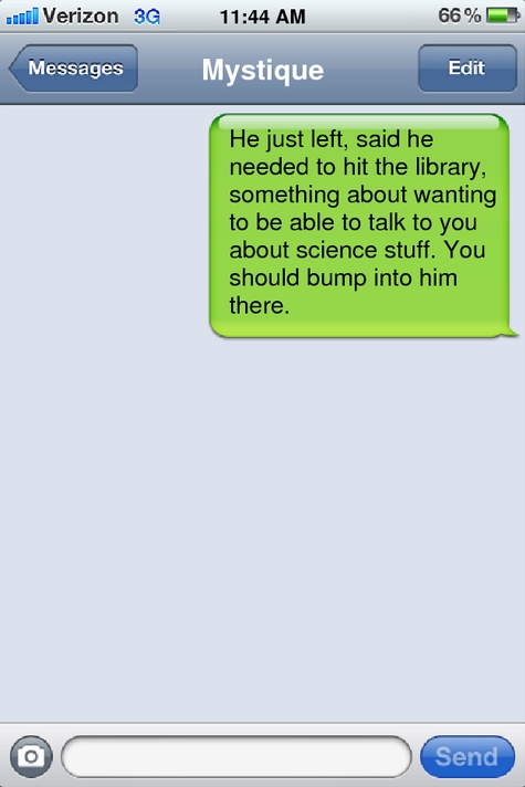 "Will you stop already? He's a good guy. I like him." Raven paused, and Erik was about to launch into his you don't know anything about him speech when she said, "He reminds me of you."