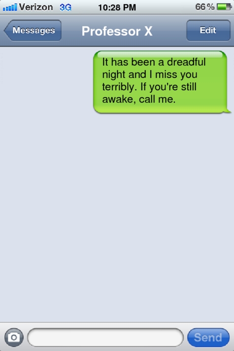 Erik glanced at his Blackberry and frowned. It wasn't like Charles not to answer, especially considering he'd just texted; just asked Erik to call him if he was still awake--and of course Erik was still awake. He was hardly going to fall asleep, not when he was waiting for Charles' call.